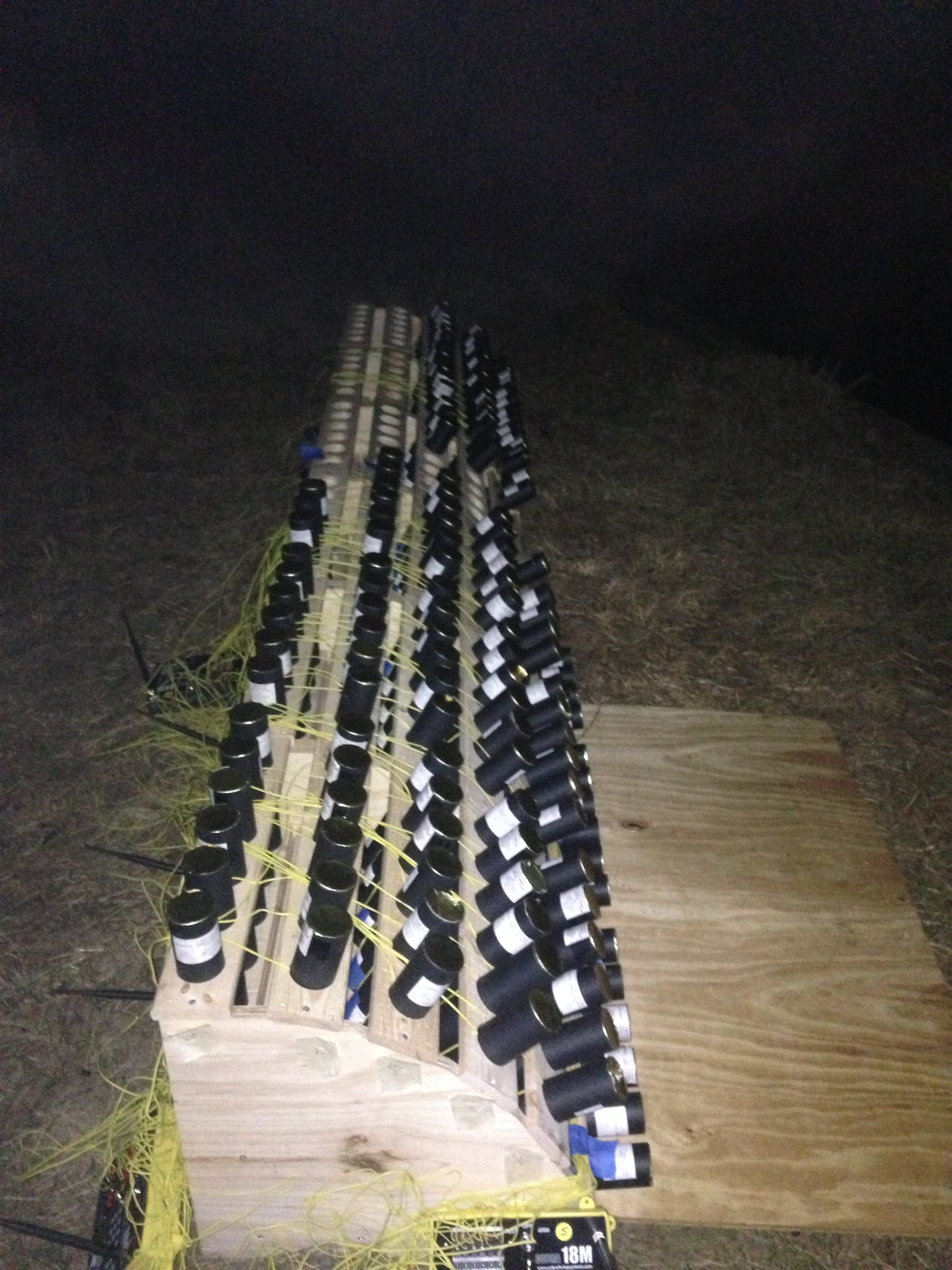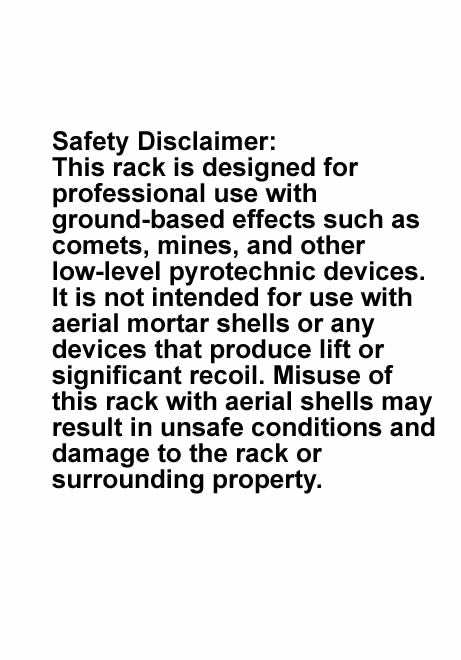 This rack is designed for professional use with ground-based effects such as comets, mines, and other low-level pyrotechnic devices. It is not intended for use with aerial mortar shells or any devices that produce lift or significant recoil. Misuse of this rack with aerial shells may result in unsafe conditions and damage to the rack or surrounding property.